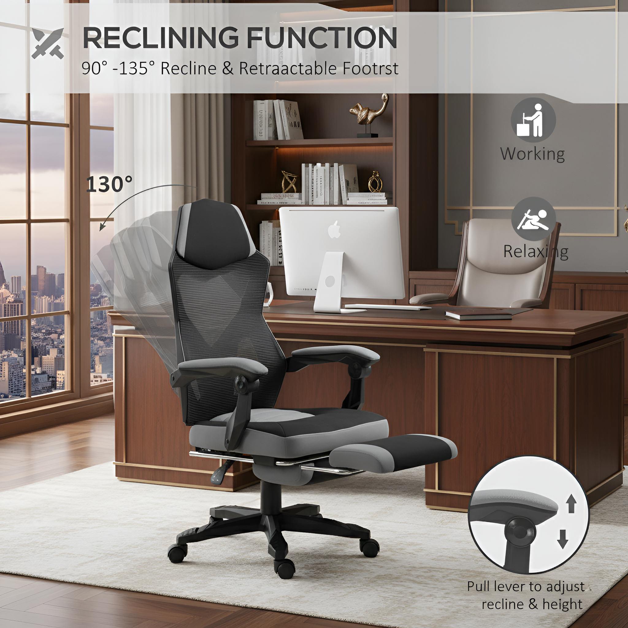 Work Hard, Rest Harder: Experience a seamless transition from work to rest. The backrest offers a smooth recline from 90° to 135° with a secure locking mechanism. When it’s time to recharge, simply pull out the retractable, soft-padded footrest to stretch out and nap in comfort.